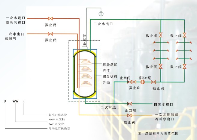 4、本產品在用水量極小或不可用水時可借助熱水管網上循環泵的工作,維持罐內水溫,使換熱部分換熱時總處于被加熱水流動狀態,使換熱充分、節能。無論使用頻繁與否,均保量恒溫供水。